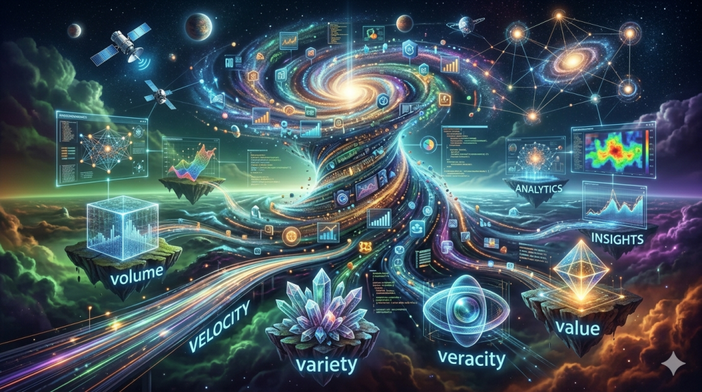 Para entenderlo bien, primero hay que saber de qué hablamos. El Big Data se define por las famosas «Tres V»: Volumen (muchísimos datos), Velocidad (lo rápido que se crean) y Variedad (hay de todo: desde excels hasta videos de TikTok o audios de WhatsApp).